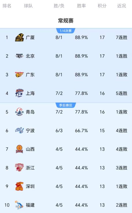 从积分榜情况来看,卫冕冠军广厦队凭借一波七连胜高居榜首,北京队、广东队都是近期输过比赛,分列第二、第三,争冠第一集团白热化。